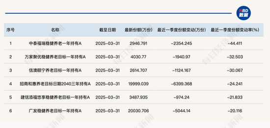 当然,还有的基金在一季度的份额下降比较明显,超过了20%。比如中泰福瑞稳健养老一年持有A,期初份额约5301万份,一季度又被赎回了2375.4万份,同时被申购数量仅有20多万份。这使得该基金截至一季度末的份额仅剩下2946.79万份。