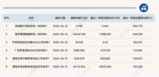 有的则是此前已经有几千万或上亿的份额,一季度增幅又超过了1亿份,使得份额累计超过了2亿份,比如银华尊禧稳健养老一年持有A、建信优享进取养老目标五年持有Y。